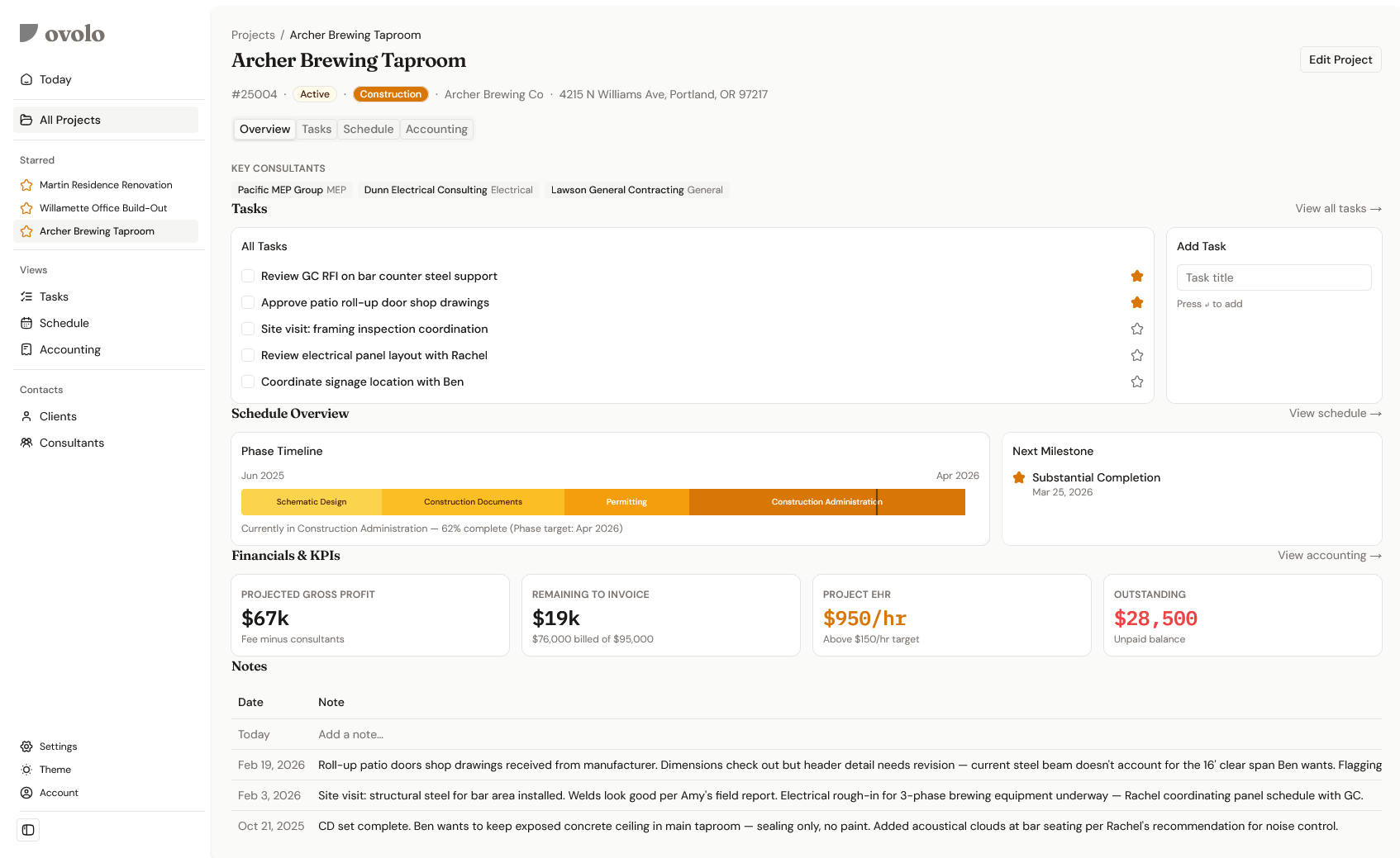 A licensed architect with 15+ years of experience running a solo firm built Ovolo for his own practice first — and uses it every day to manage over 40 active projects.